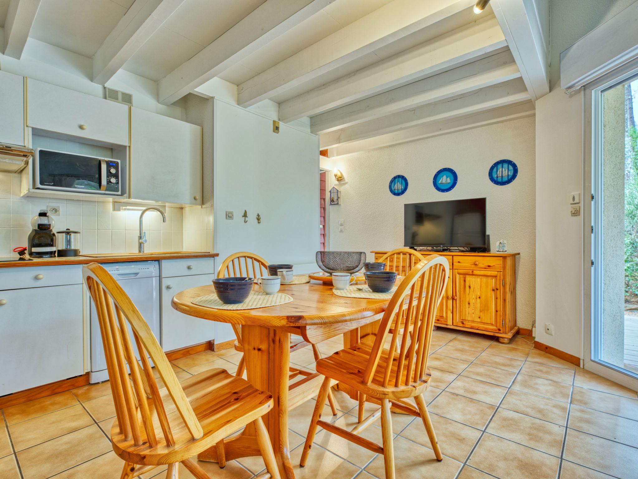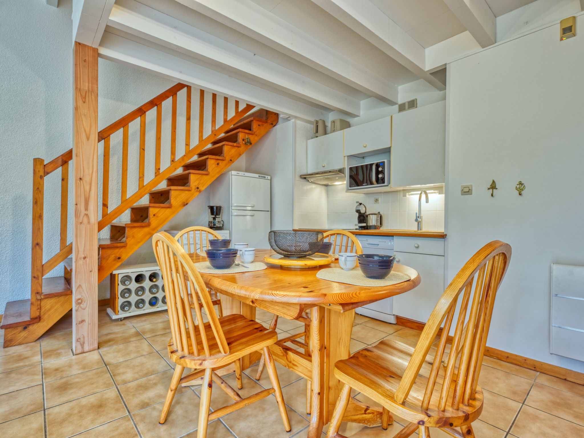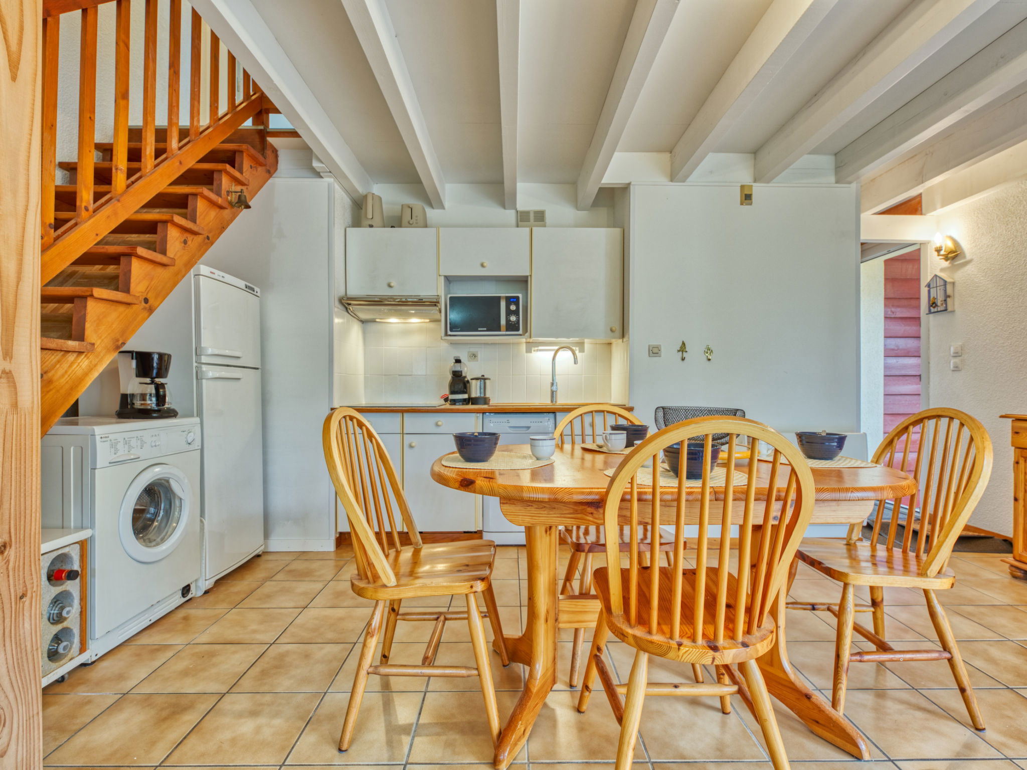Maison jumelée 4 pièces 65 m2 sur 2 niveaux. Aménagement confortable: séjour/salle à manger avec TV (écran plat). Sortie sur la terrasse. 1 chambre avec 1 grand-lit (140 cm, longueur 190 cm). Cuisine (lave-vaisselle, 3 plaques vitrocéramiques, grille-pain, bouilloire électrique, micro-ondes, cafetière électrique, Capsules pour machine à café (Dolce gusto) (NON INCLUSES)). Douche, WC séparé. Chauffage électrique. À l'étage supérieur: 1 chambre avec 2 lits (90 cm, longueur 190 cm). 1 chambre avec 1 grand-lit (140 cm, longueur 190 cm). Terrasse 25 m2, situation sud, jardinet 250 m2. Meubles de terrasse, barbecue, chaises longues. A disposition: lave-linge. Internet (Connexion WIFI, gratuit). Place de parking. Veuillez noter: logement non-fumeur. Maximum 1 animal/ chien autorisé. Détecteur de fumée.