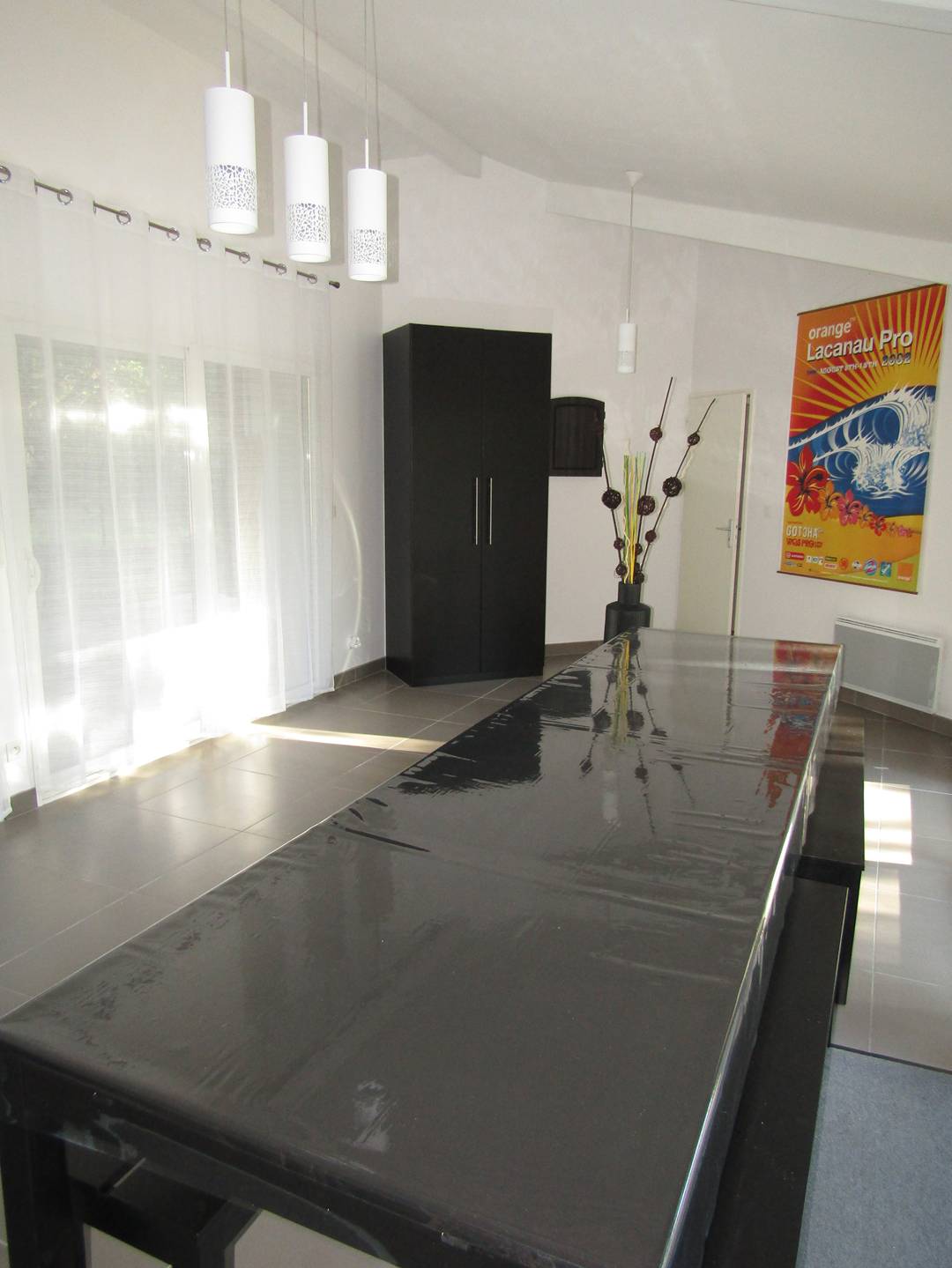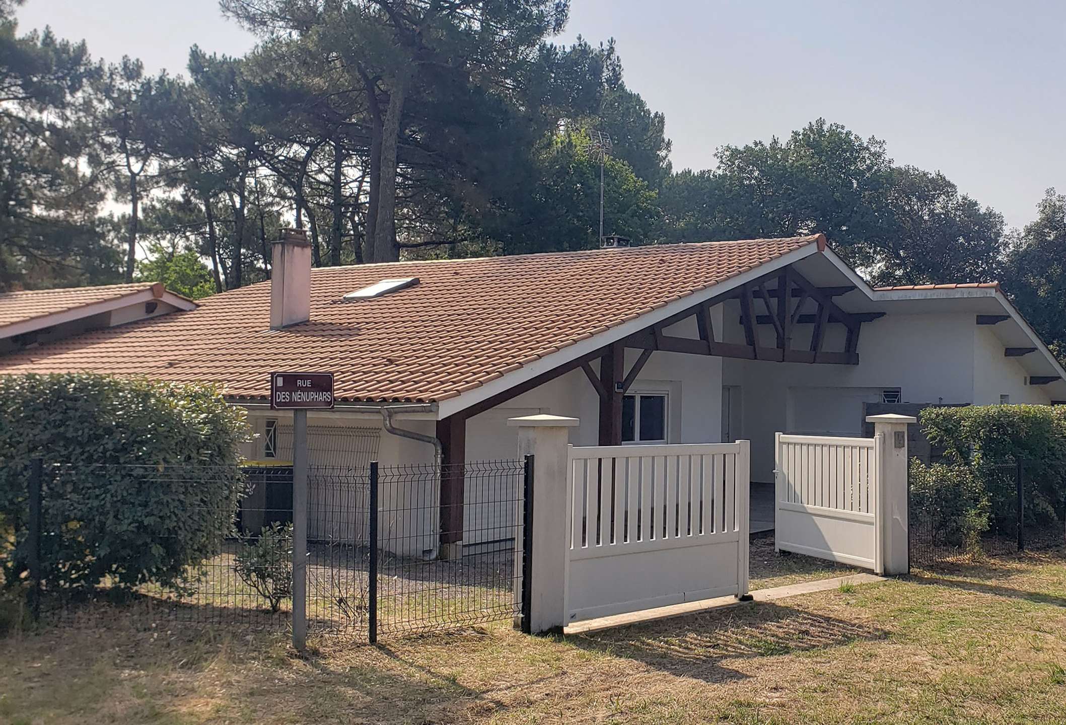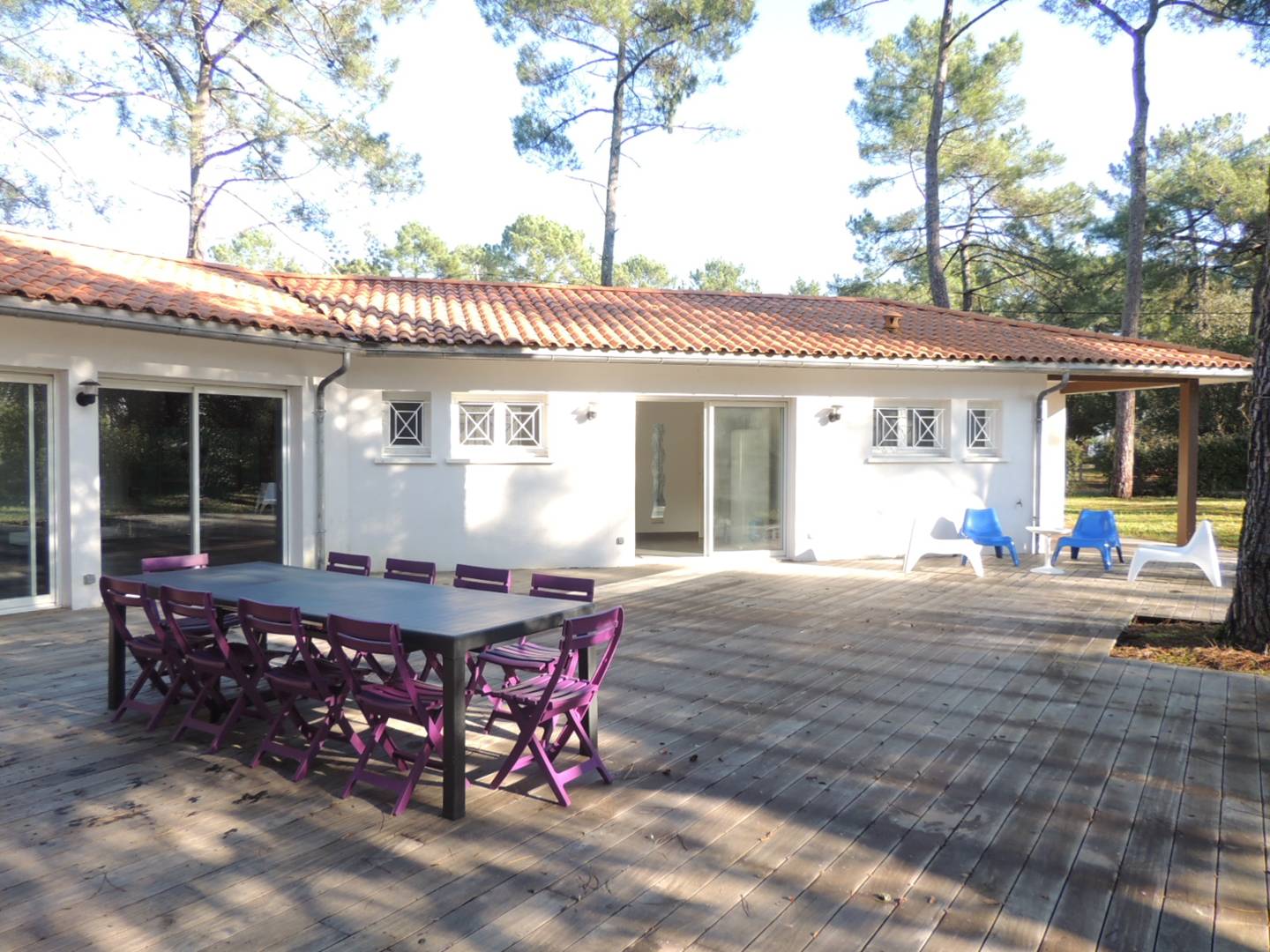 Grande villa indépendante 240m² environ, classée 4 étoiles, plain-pied, secteur Longarisse, à proximité du lac de Lacanau (80m de la plage), sur terrain clos de 1400m² environ. Idéale pour l'accueil d'une grande famille avec enfants. Salon traversant, 28m² environ, ouvrant sur terrasse bois 130m². Cuisine/salle-à-manger, 40m² environ, équipée d’un îlot central et d’un grand espace repas. Une aile comportant 2 chambres climatisées (1 avec lits jumeaux de 90), et une avec lits séparés), une salle d’eau (douche italienne), des WC indépendants, ainsi qu'une suite parentale : grande chambre climatisée 18m² (lit 160 cm), salle d’eau (douche italienne, deux vasques), WC indépendants. Un petit salon télévision/salle de jeux pour les enfants. Une aile comportant 4 chambres avec ventilateurs (2 avec lits séparés, 1 avec lit double de 160), 1 salle d’eau (douche italienne) et 1 salle de bain avec baignoire et table à langer, 2 WC indépendants. 2 terrasses bois de part et d’autre de la cuisine traversante équipées de mobilier de jardin. Un espace terrasse, semi-couvert côté entrée, avec douche extérieure et BBQ. L'océan et ses commerces sont accessibles en voiture ou à vélo (pistes cyclables dans la pinède) à 10 km, le golf, le casino et les tennis à 7 km, un club nautique à 2 km.