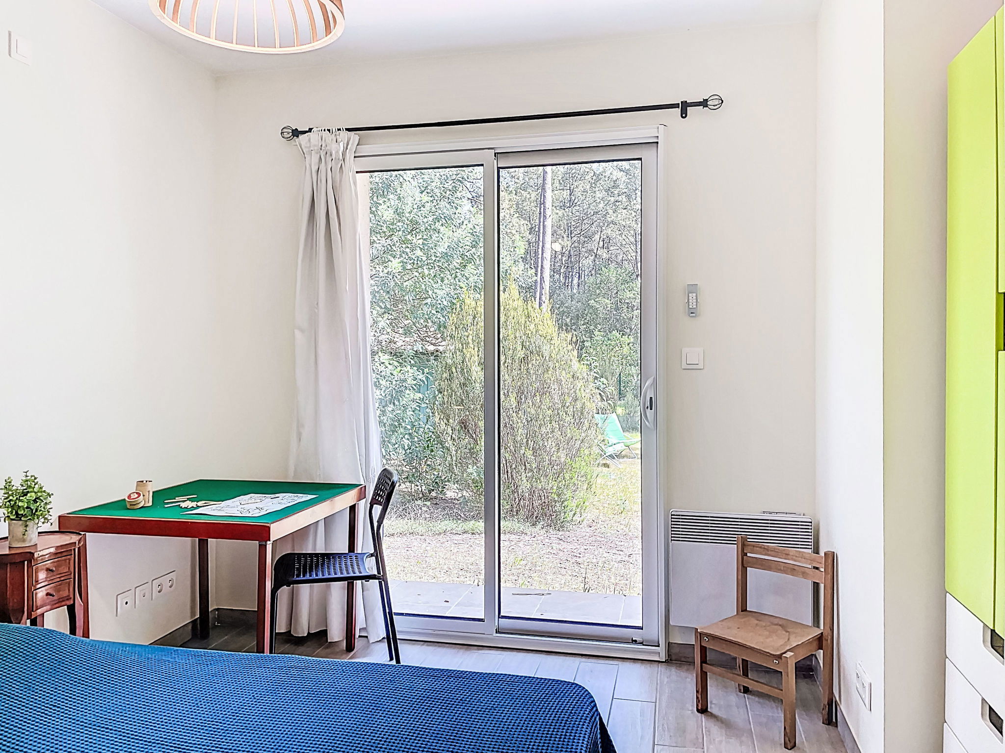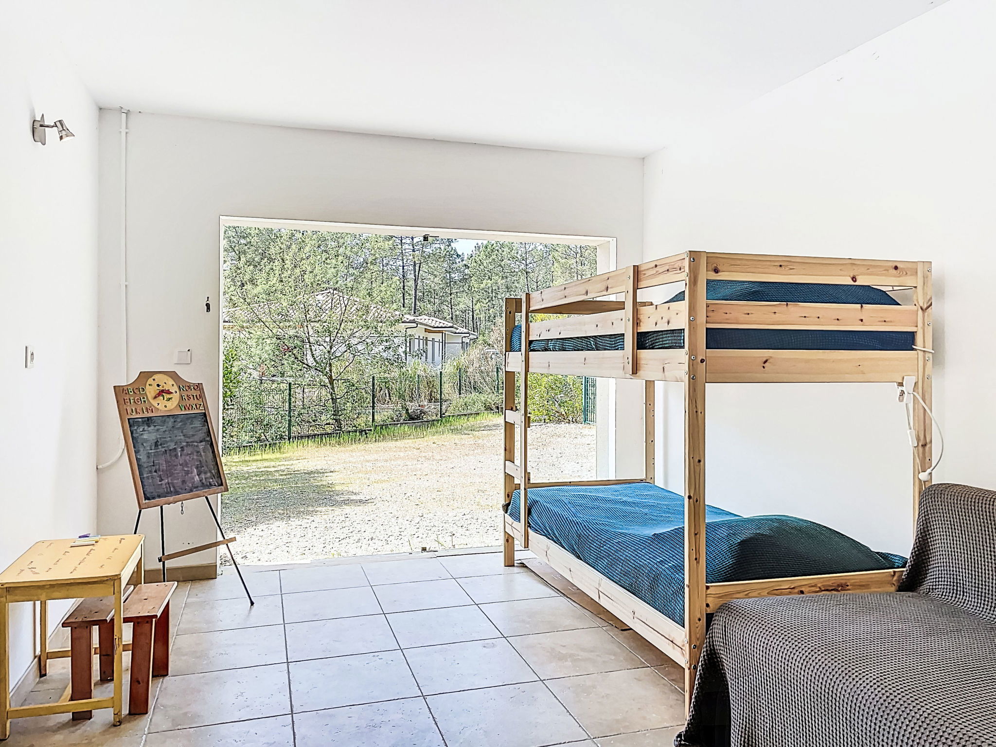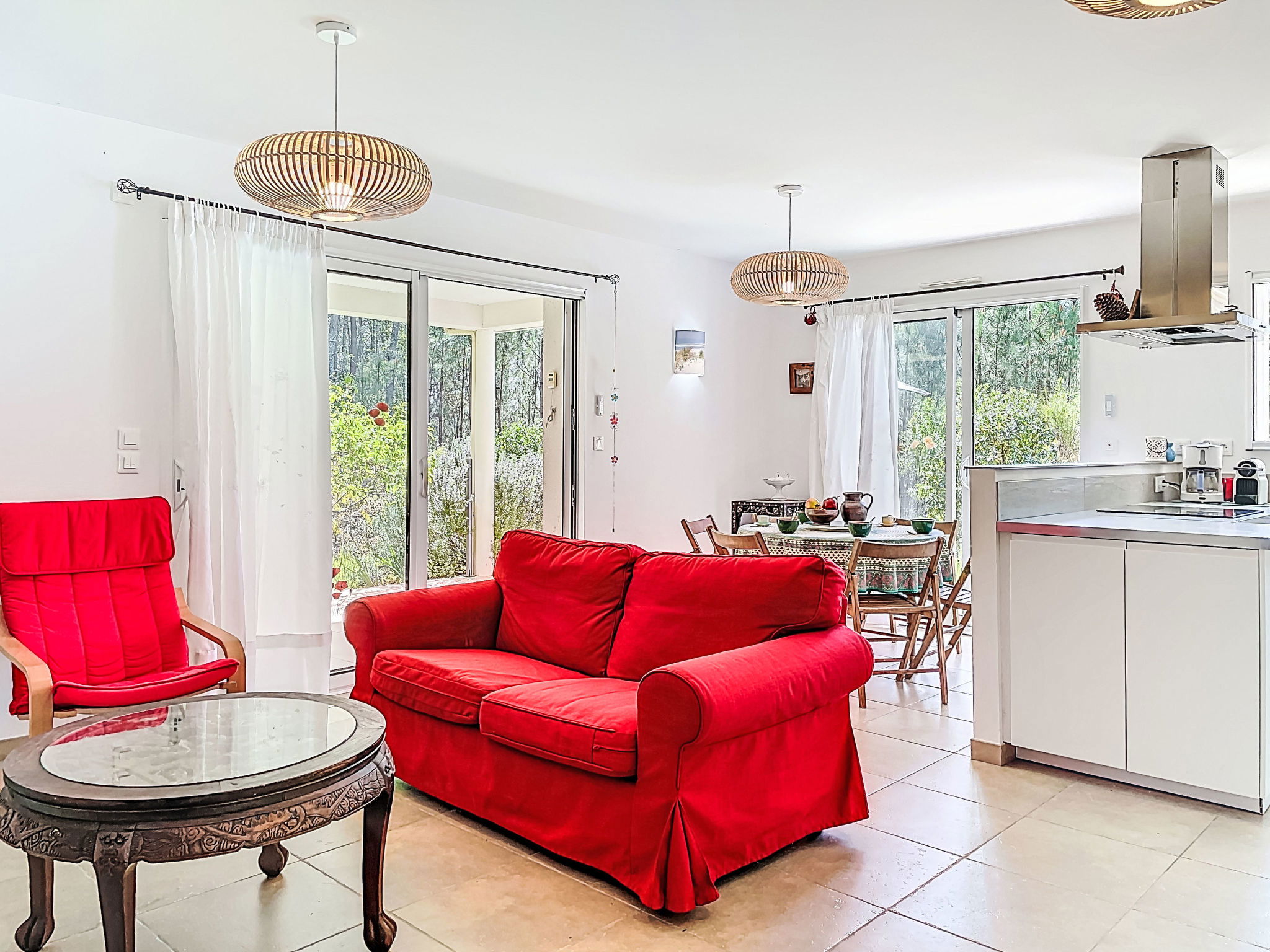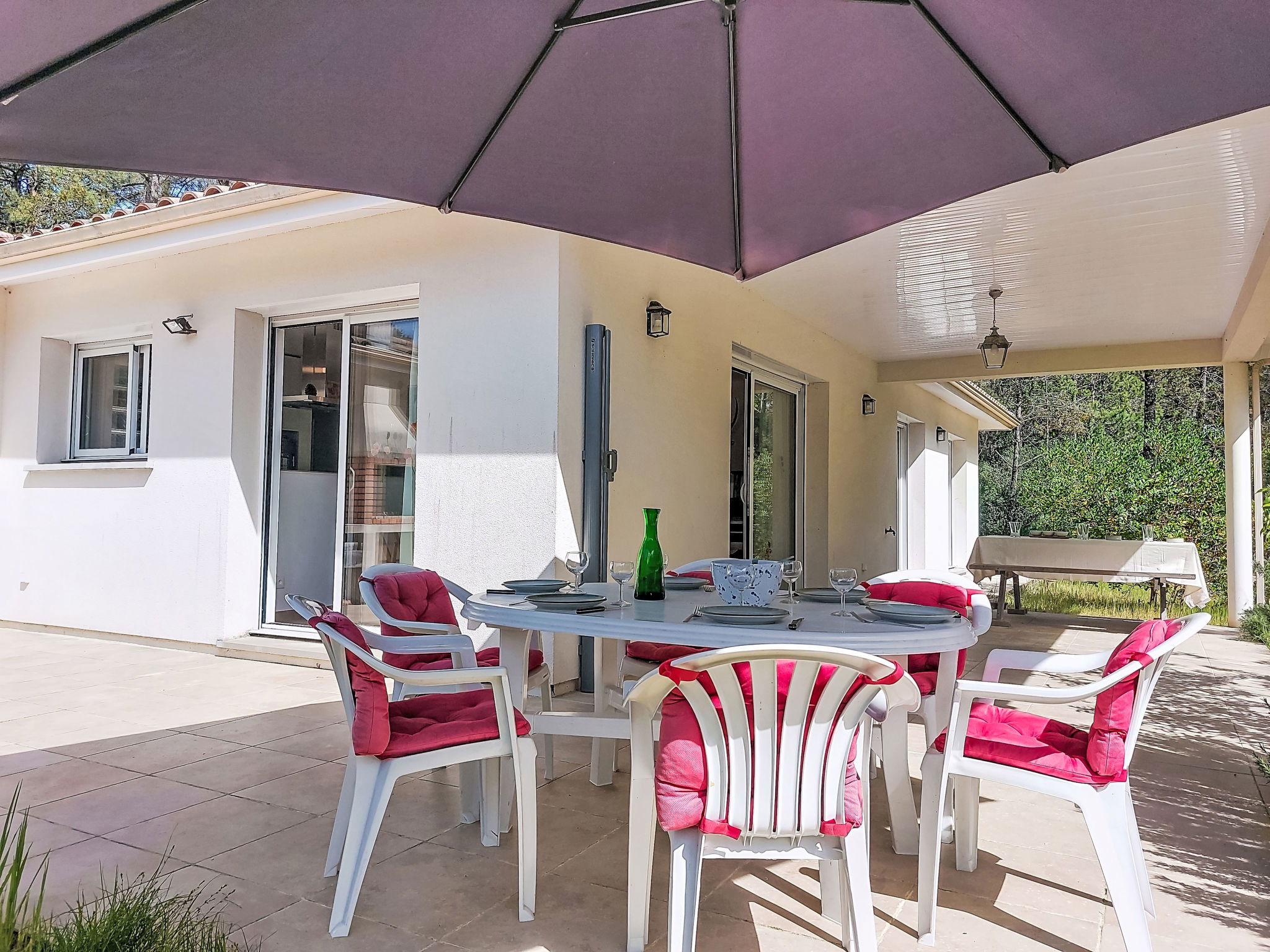 "hibiscus", maison 5 pièces 90 m2, situation sud. Aménagement agréable et plaisant: grand séjour/salle à manger avec écran plat, poêle à bois, ventilateur et volet roulant électrique. Sortie sur le jardin, sur la terrasse, orientée sud. 1 chambre d'enfants 20 m2 avec baie vitrée orientée ouest avec 1 x 2 lits superposés (90 cm, longueur 200 cm), 1 lit pliant (140 cm, longueur 200 cm), lavabo. Sortie sur la terrasse. 1 chambre avec 1 lit double (2 x 80 cm, longueur 200 cm). 1 chambre avec 1 lit double (2 x 80 cm, longueur 200 cm), chauffage électrique. 1 chambre avec 1 grand-lit (1 x 160 cm, longueur 200 cm). Cuisine ouverte (1 plaque de cuisson, four, lave-vaisselle, 3 feux, micro-ondes, congélateur) avec passe-plat. 2 salles de bains, douche, douche/WC, double vasque. Chauffage électrique. Grande terrasse 40 m2, situation sud, grand jardin 100 m2, situation sud. Meubles de terrasse, barbecue, chaises longues. Très belle, sur la forêt. A disposition: lave-linge. Place de parking (cloturée). Veuillez noter: adapté(e) aux familles. Maison non-fumeur. Annonce d'un particulier (art 155, IV du CGI).