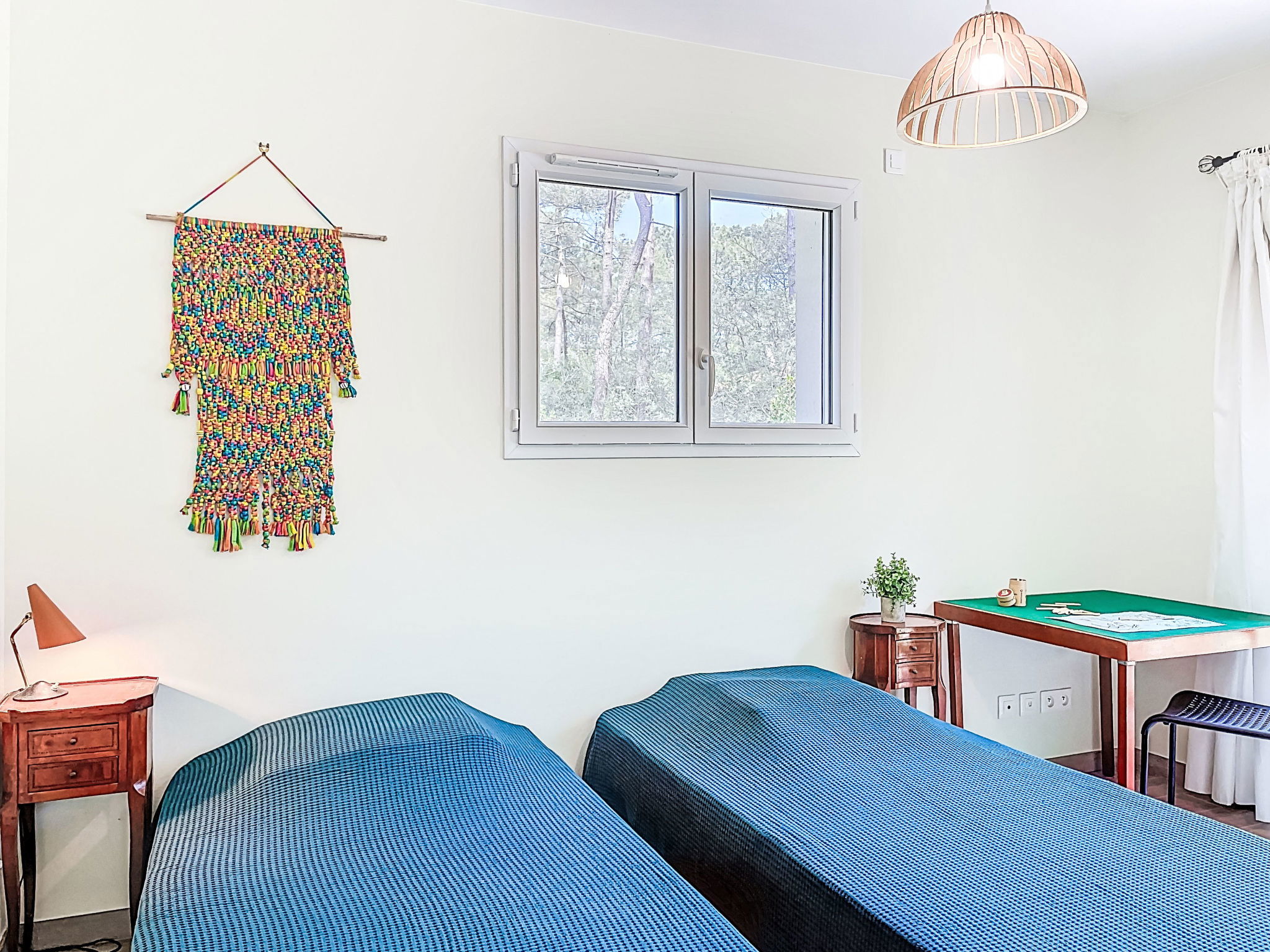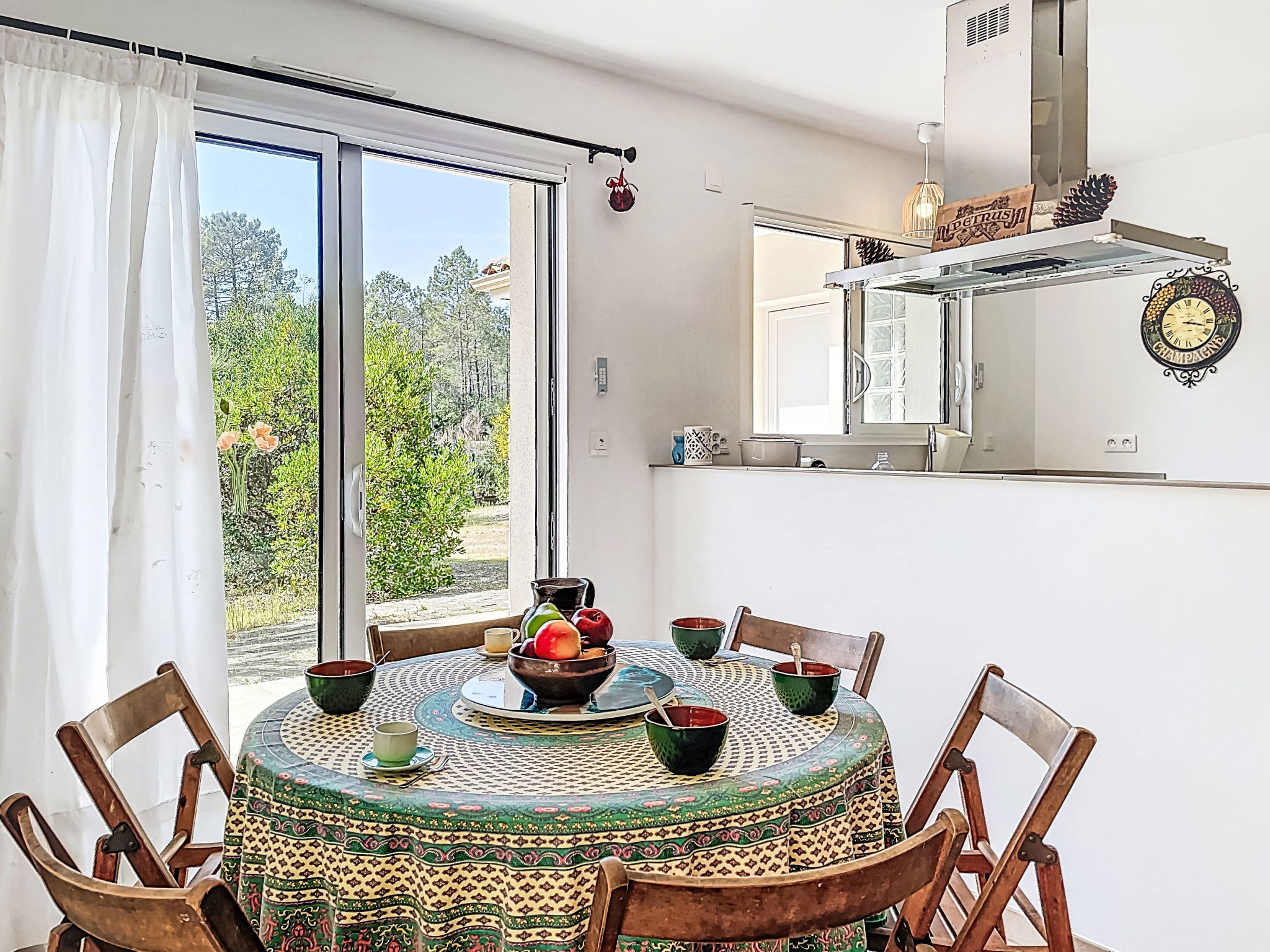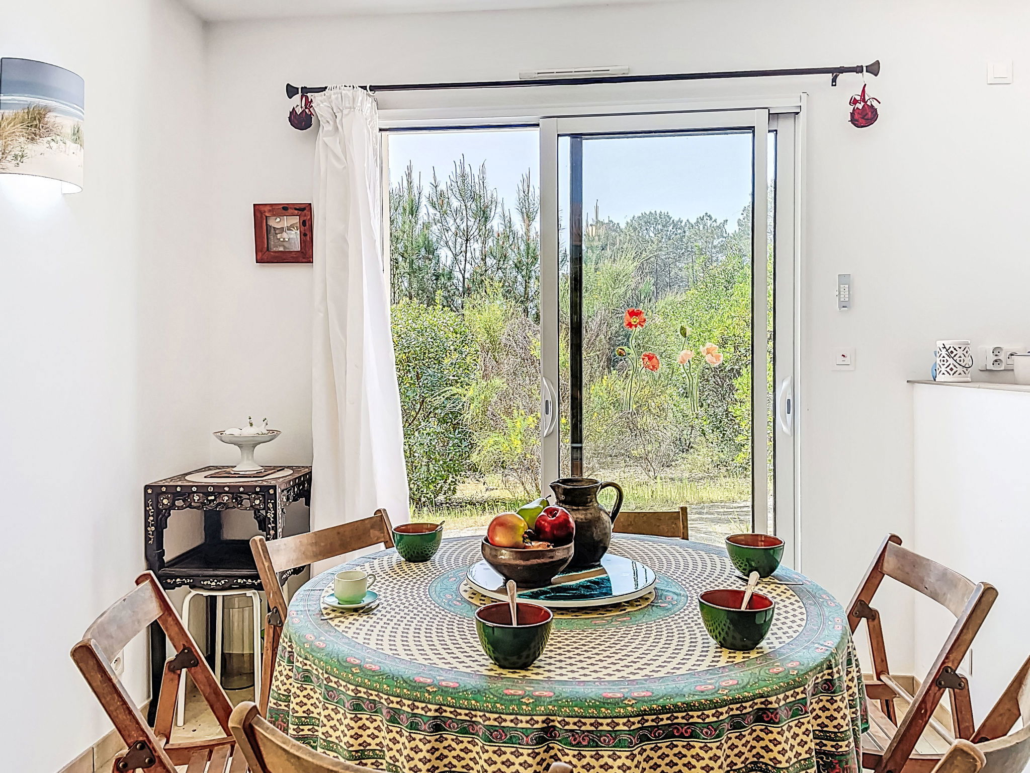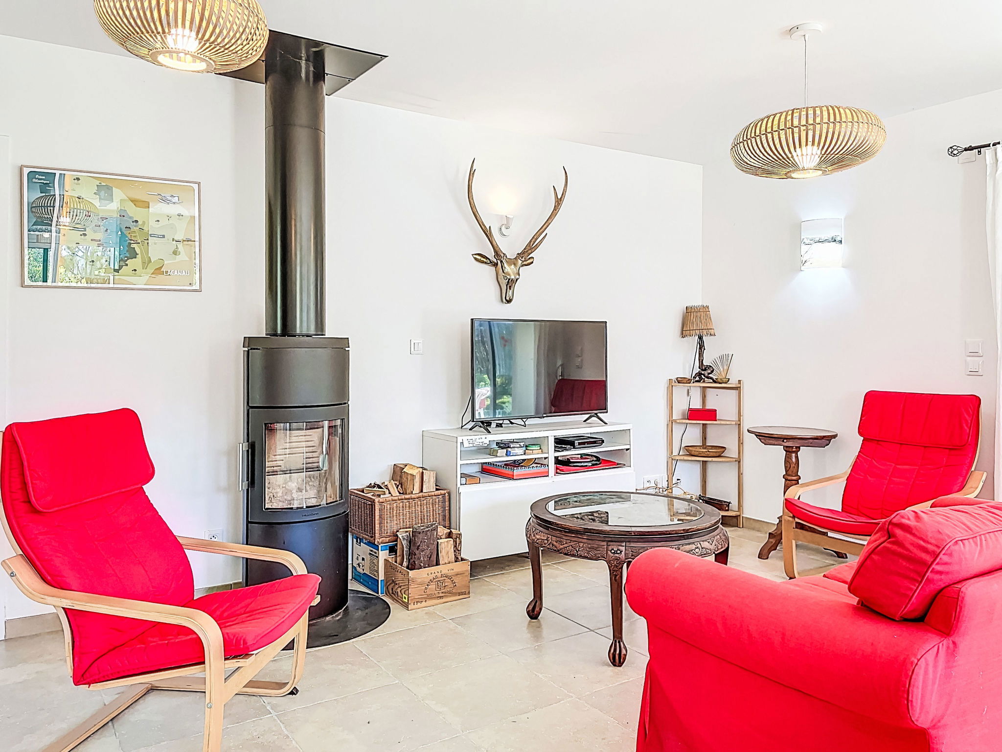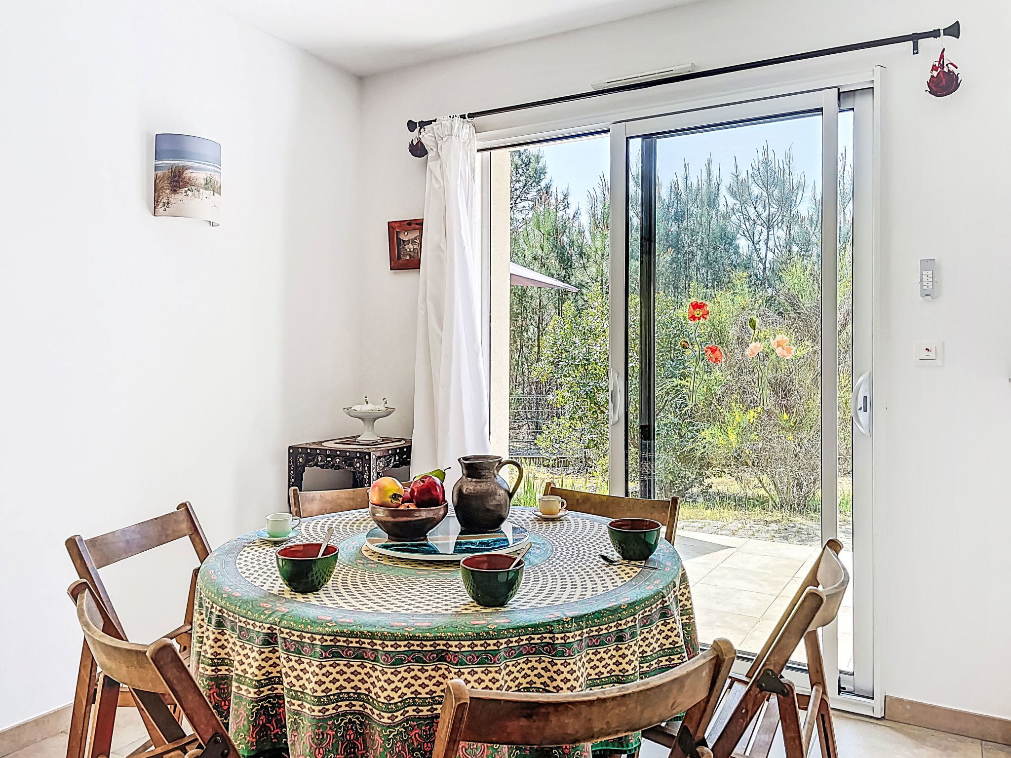 "hibiscus", maison 5 pièces 90 m2, situation sud. Aménagement agréable et plaisant: grand séjour/salle à manger avec écran plat, poêle à bois, ventilateur et volet roulant électrique. Sortie sur le jardin, sur la terrasse, orientée sud. 1 chambre d'enfants 20 m2 avec baie vitrée orientée ouest avec 1 x 2 lits superposés (90 cm, longueur 200 cm), 1 lit pliant (140 cm, longueur 200 cm), lavabo. Sortie sur la terrasse. 1 chambre avec 1 lit double (2 x 80 cm, longueur 200 cm). 1 chambre avec 1 lit double (2 x 80 cm, longueur 200 cm), chauffage électrique. 1 chambre avec 1 grand-lit (1 x 160 cm, longueur 200 cm). Cuisine ouverte (1 plaque de cuisson, four, lave-vaisselle, 3 feux, micro-ondes, congélateur) avec passe-plat. 2 salles de bains, douche, douche/WC, double vasque. Chauffage électrique. Grande terrasse 40 m2, situation sud, grand jardin 100 m2, situation sud. Meubles de terrasse, barbecue, chaises longues. Très belle, sur la forêt. A disposition: lave-linge. Place de parking (cloturée). Veuillez noter: adapté(e) aux familles. Maison non-fumeur. Annonce d'un particulier (art 155, IV du CGI).