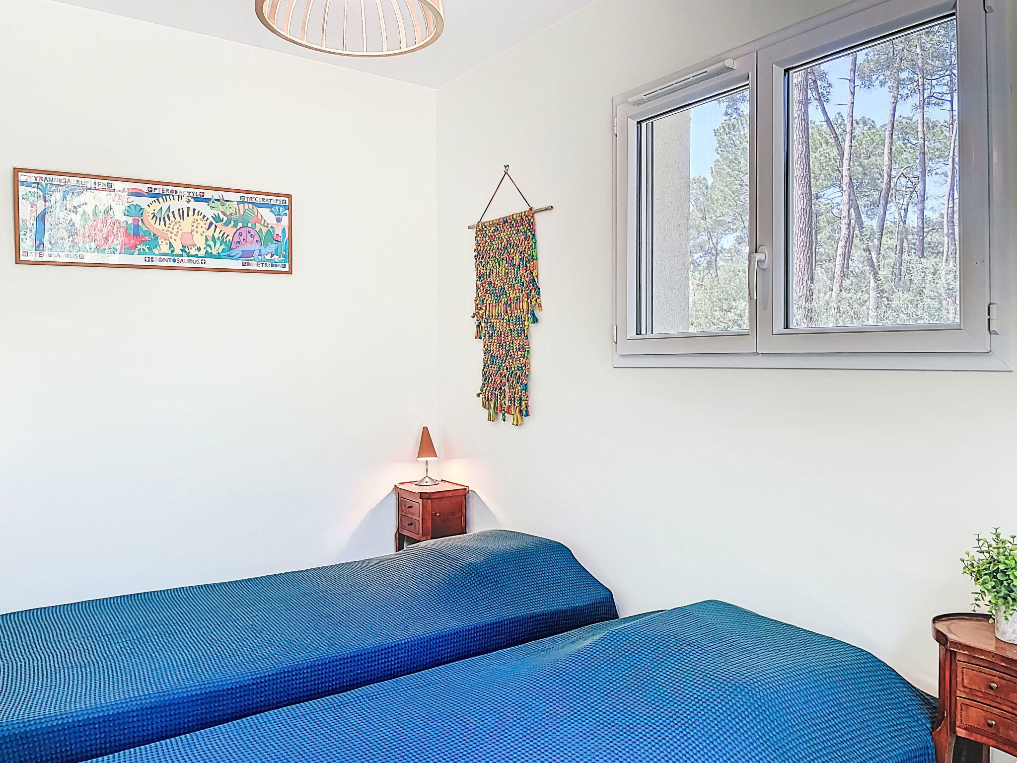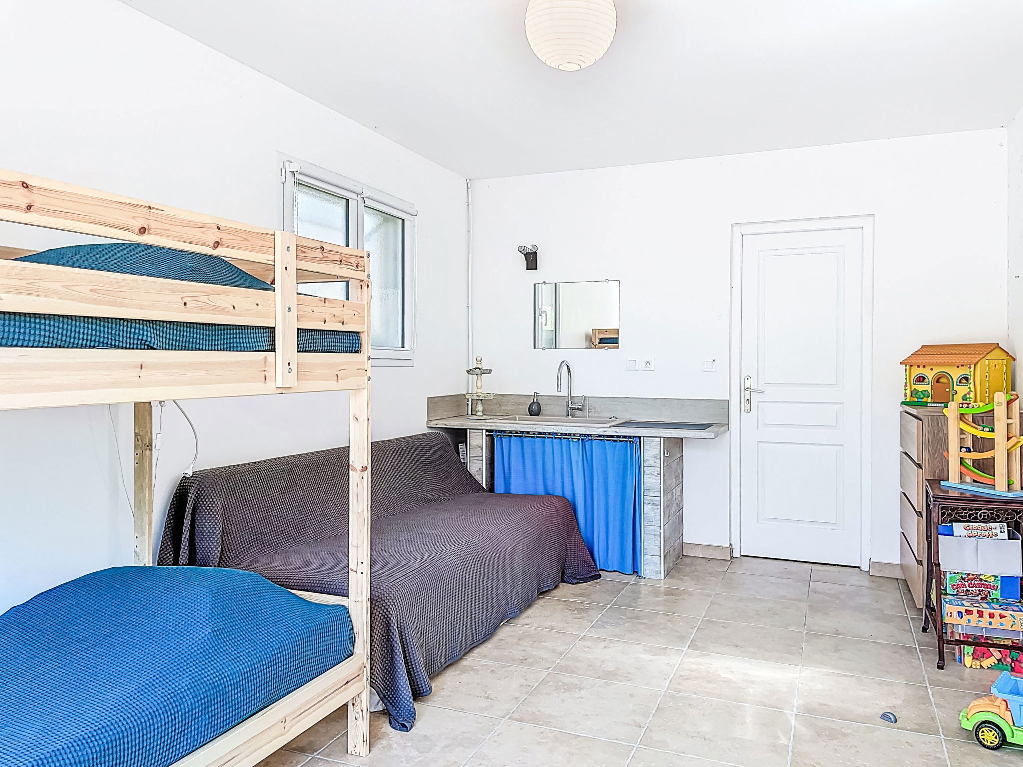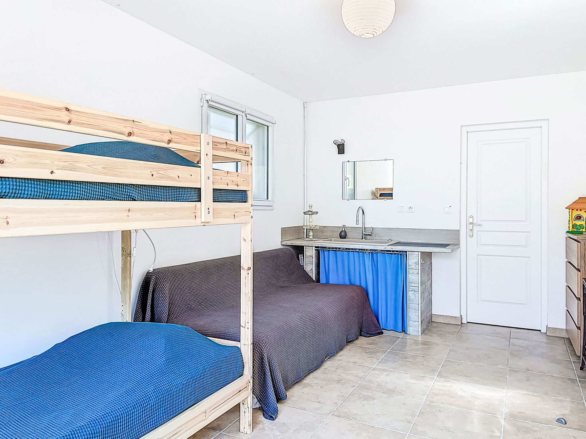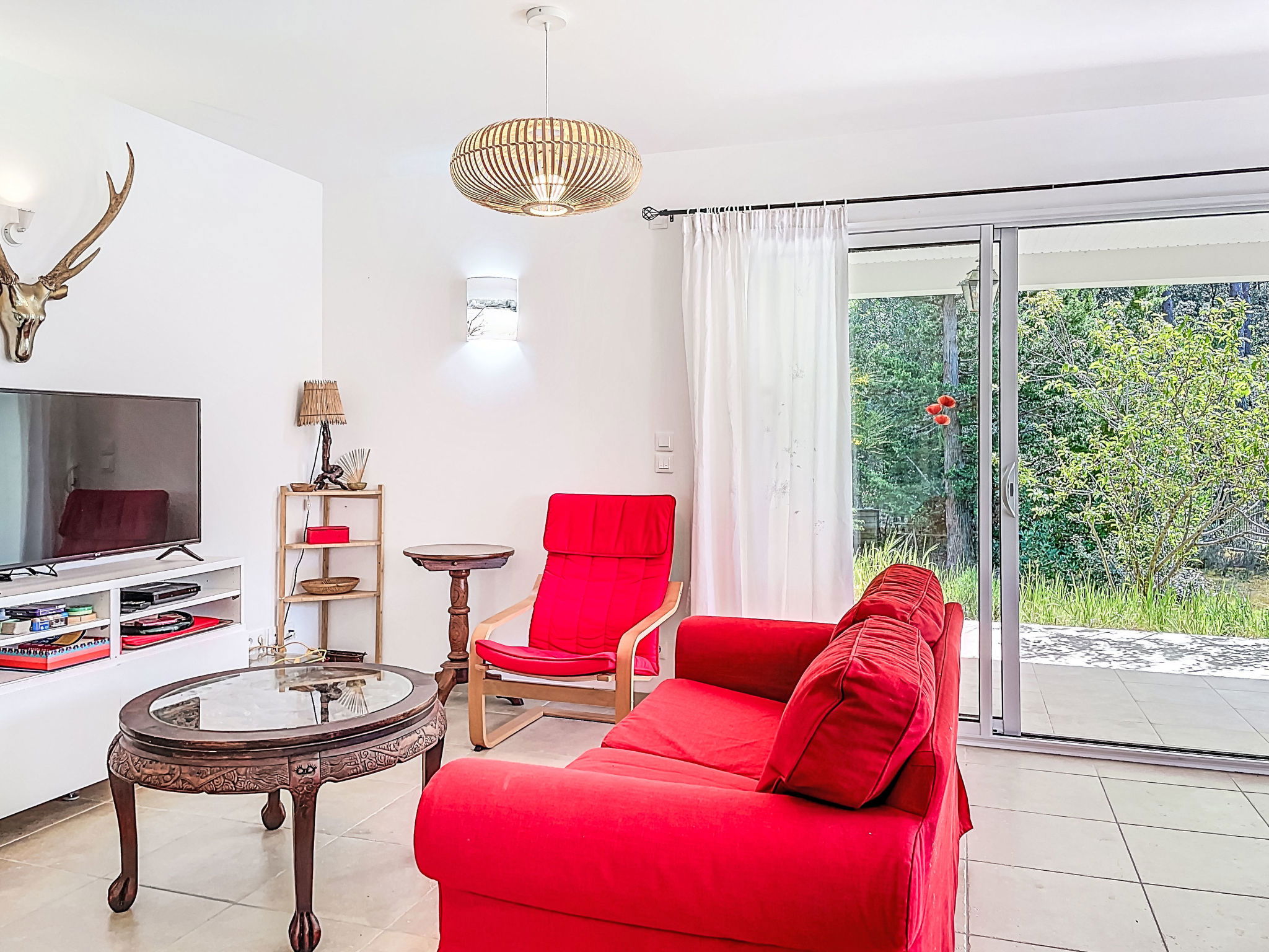 "hibiscus", maison 5 pièces 90 m2, situation sud. Aménagement agréable et plaisant: grand séjour/salle à manger avec écran plat, poêle à bois, ventilateur et volet roulant électrique. Sortie sur le jardin, sur la terrasse, orientée sud. 1 chambre d'enfants 20 m2 avec baie vitrée orientée ouest avec 1 x 2 lits superposés (90 cm, longueur 200 cm), 1 lit pliant (140 cm, longueur 200 cm), lavabo. Sortie sur la terrasse. 1 chambre avec 1 lit double (2 x 80 cm, longueur 200 cm). 1 chambre avec 1 lit double (2 x 80 cm, longueur 200 cm), chauffage électrique. 1 chambre avec 1 grand-lit (1 x 160 cm, longueur 200 cm). Cuisine ouverte (1 plaque de cuisson, four, lave-vaisselle, 3 feux, micro-ondes, congélateur) avec passe-plat. 2 salles de bains, douche, douche/WC, double vasque. Chauffage électrique. Grande terrasse 40 m2, situation sud, grand jardin 100 m2, situation sud. Meubles de terrasse, barbecue, chaises longues. Très belle, sur la forêt. A disposition: lave-linge. Place de parking (cloturée). Veuillez noter: adapté(e) aux familles. Maison non-fumeur. Annonce d'un particulier (art 155, IV du CGI).